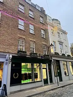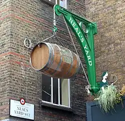 The western stretch, one of the prongs that runs off Seven Dials, was known as Queen Street until 1903.[1] The eastern stretch was named Shorts Gardens after William Short, the gardener of Gray's Inn who purchased the land in 1590 when it was still open countryside outside London and was owned by his descendants until 1690 when it was sold off for development.[2][3] The western end featured houses built in the late 17th century and intended for the rich, but during the following century this became a slum as part of the rookery of St Giles. The eastern stretch had poorer inhabitants from the beginning and at one point became a centre for Italian organ grinders. This gave way over time to warehouses servicing the fruit trade in nearby Covent Garden market.[2] When built, it was residential; it is now largely commercial. Neal's Yard runs off the street as does Nottingham Court. At Seven Dials on the corner between Shorts Gardens and Monmouth Street is The Crown pub, dating back as tavern to at least 1700.[4]
