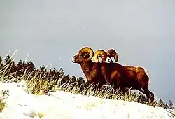 Native herbivores such as the moose are found in small numbers near waterways, especially at lower elevations. Moose populations in northwestern Wyoming and other areas of North America have been on the decline since the end of the 20th century, possibly due to a parasite.[53] There were an estimated 739 moose in the forest in 2006 which is almost 300 fewer than there were 20 years earlier.[52][54] Other ungulate species are much more common and there are over 20,000 elk (also known as wapiti) and 40,000 mule deer.[54] Bighorn sheep and mountain goats inhabit the rocky terrain and highest elevations. During the winter, one of the largest bighorn sheep herds in the lower 48 states congregate in the region around Dubois, Wyoming; however, their numbers since 1990 have been diminished due to disease transmitted from contact with domesticated sheep and goats.[55] An estimated 5,000 bighorn sheep are found throughout the forest and a small but stable population of 200 mountain goats reside in the northernmost portions of the forest.[54] Bison and pronghorn antelope are two other ungulates that live on the forest and have sustainable populations.[50]