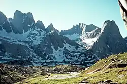 The Wind River Range is in the southern portion of the forest and is composed primarily of Precambrian granitic rock.[76] Gannett Peak, the tallest mountain in Wyoming, is in the northern part of the range. Altogether eight peaks exceed 13,500 ft (4,100 m) and 119 rise at least 12,000 ft (3,700 m) above sea level.[77] Fremont Peak, the second highest peak in the range, was originally believed to be the tallest mountain in the Rocky Mountains due to its prominence when viewed from the Oregon Trail by early pioneers.[78] The Wind River Range is popular with mountain climbers because of its solid rock and variety of routes.[79] The Cirque of the Towers in the Popo Agie Wilderness is one of the more popular climbing and hiking destinations, and an estimated 200 different climbing routes are located within the peaks that surround the cirque.[78]