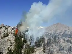 Between the years 1970 and 2012, Shoshone National Forest averaged 25 fires annually, of which half were due to natural ignition from lightning, which accounted for 90 percent of the total acreage burned. The remaining acreage that burned was due to campfires that got out of control or from other causes.[67] In Shoshone National Forest, the highest fire incidence is generally in the months of August and September.[67] An average of 2,334 acres (945 ha) burns annually, with the worst year in the past century being 1988, when 194,430 acres (78,680 ha) burned from fires that had spread from the conflagration that engulfed Yellowstone National Park and the surrounding region.[67] After the Yellowstone region fires of 1988, an effort to identify areas of similar fire potential was implemented.[62] Fire managers at Shoshone National Forest work with a number of outside agencies to incorporate fire restrictions, fuels management, and a controlled burn plans to reduce the chances of a catastrophic fire.[68] The dead and dying trees which have been killed by various species of bark beetle may have a great impact on future forest fires.[40] Fire managers have stated the worst time for increased fire activity is 1–2 years after the trees are killed and then again after the trees have fallen many years later.[69]