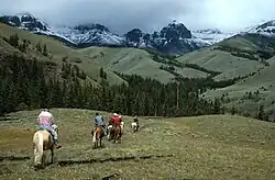 Shoshone National Forest practices conservation of resources, which ensures a sustainable flow of some raw materials from the forest, such as lumber for construction purposes and wood pulp for paper products.[27] The forest averages an annual harvest of 4.5 million board-feet of timber for the purposes of commercial log home construction and another 2.5 million board-feet of wood collection from dead and down trees that are used for firewood and poles.[28] Additionally, low-scale mineral extraction and oil and gas exploration and recovery are also conducted, though in Shoshone National Forest this has become less common due to a consensus to protect the natural surroundings. Only 8,570 acres (3,470 ha) of oil and gas leases were filed as of 2013.[29] More common than logging and mining are the lease options that are offered to ranchers to allow them to graze cattle and sheep.[30] The U.S. Forest Service provides guidelines and enforces environmental regulations to ensure that resources are not overexploited and that necessary commodities are available for future generations, though conservation groups have voiced concerns over the management practices of the leasing program and especially cattle overgrazing problems.[31] Leases for sheep grazing have declined considerably since the 1940s while cattle grazing has remained relatively constant.[32]