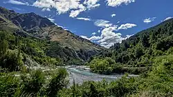 The Shotover River (Māori: Kimiākau) is located in the Otago region of the South Island of New Zealand.[1] The name correctly suggests that this 75-kilometre (47 mi) long river is fast flowing, with numerous rapids. The river flows generally south from the Southern Alps on its journey running through the Skippers Canyon, draining the area between the Richardson Mountains and the Harris Mountains, before flowing into the Kawarau River east of Queenstown.