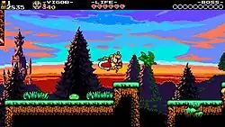 After creating the mechanics and abilities for Joustus, the developers planned the total number of cards. The final roster of cards features the likenesses of most characters in the Shovel Knight franchise.[14] The team spent a significant amount of time brainstorming how the player would obtain new cards in-game, at one point designing a collectable item called "Card Juice" that could transform platforming enemies into cards.[15] The ability to steal cards from defeated opponents was inspired by collectable card games, and required the creation of a unique deck for every hostile character. To balance the card-playing AI that the player would face, the developers constructed the programming to make decisions intending to prolong each game, while allowing it to shift its behaviors to fit the player's skill. Joustus was originally intended to be played at villages located around the world map, though these locations were replaced by smaller pubs called Card Houses.[15] The game was planned to release on April 9, 2019, but was delayed,[16] and was later launched for Windows, macOS, Linux, PlayStation 3, PlayStation 4, PlayStation Vita, Wii U, Xbox One, and Nintendo Switch on December 10, 2019.[17][18][19] A version for Nintendo 3DS was released on December 13.[20]