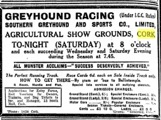 The track was constructed by the Southern Greyhound and Sports Company Limited, in part of the 27 acres known as Lower Park, which was owned by the Cork Agricultural Buildings Co Ltd. Lower Park was used by the County Cork Agricultural Society and ran from the present-day Centre Park Road to Blackrock.[3] The society later became the Munster Agricultural Society, and buildings were constructed in c. 1895.[4]