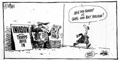 Bottom: Cartoon by Michael Atchison for the Adelaide Advertiser on 1 August 1990 equating the tensions between the SANFL and Port Adelaide over the latter's attempt to join the AFL with the then concurrent Iraqi invasion of Kuwait.