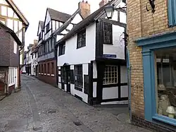 The town suffered very little from air raids in the Second World War; the worst case was in 1940, when a woman and her two grandchildren were killed when a cottage was destroyed on Ellesmere Road, the only local air raid deaths.[104] Therefore, many of its ancient buildings remain intact and there was little redevelopment in the 1960s and 1970s. However, some historic buildings were demolished to make way for the brutalist architectural style of the 1960s, though the town was saved from a new inner ring road due to its challenging geography.[105] A notable example of 1960s/70s construction in Shrewsbury was Telecom House on Smithfield Road, demolished in the 2000s.[106]