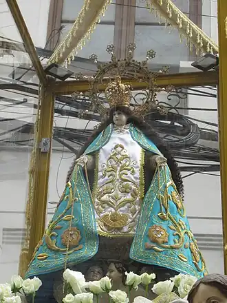 The original de tallado image presents the Blessed Virgin Mary as Our Lady of Mercy standing on a cloud with putti (little angels), both hands are raised and extended and previously holding a chain or the White Mercedarian Scapular, has long and wavy hair covered with a dainty veil wears a crown and the diagnostic doce estrellas. The original crown and halo were replaced with a 14-karat gold crown decorated with white pearls and diamonds and a gold-plated halo made of silver with pearls, diamonds and precious stones after the Pontifical Coronation Ceremony. The head of the Virgin is looking sideway which is quite interesting for this image. The Virgin wears a wig now, and the Mercedarian habit—the white habit and white scapular and a blue cape. The image is now securely enshrined on the side altar of the church after it received its pontifical and canonical crown and halo.