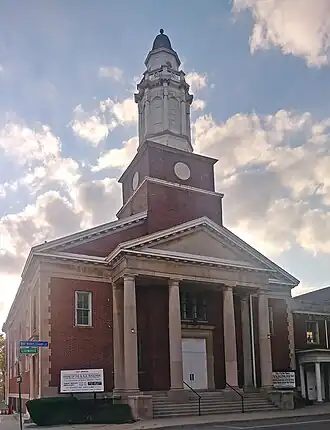 The church building is a two-story, rectangular structure made from red brick with stone trim. The front-gabled roof is covered with asphalt shingles and topped with a bell tower located at the center front. A two-story Doric portico, topped with a pediment, runs across the front. A projecting section under the portico contains paired entry doors. Above the entry is a triple window, and to either side of the entry bay are narrow vertical window openings on the first floor. The second floor contains window openings on wither side of the portico.[2]