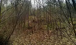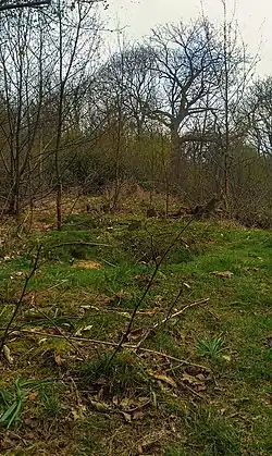 Shrub's Wood Long Barrow is in an area of woodland, the eponymous Shrub's Wood, near the village of Elmsted.[1] It can be inspected from an adjacent public path.[2] The barrow stands on a sandy sub-soil that is part of the Lenham Beds.[1] The North Downs trackway is around 2 kilometres (1.2 mi) to the south-west of the barrow.[1]