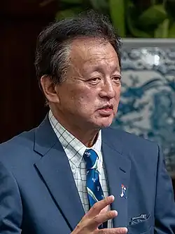He is an assenter of "The Truth About Nanjing (movie)." He was previously a member of the Kibō no Tō political party, being the party's candidate for Prime Minister, and the Democratic Party of Japan, along with the Democratic Party for the People.