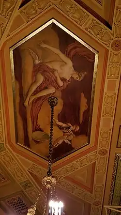 The New York Times described the decorative scheme as originally being "old Venetian gold, absinthe green, and amethyst".[7] Mythological motifs are heavily featured in the interior.[33] J. Mortimer Lichtenauer painted murals along the boxes, the area above the proscenium arch, and the ceiling. The murals contain figures with masks of Minoan and renaissance inspiration, as well as semi-nude females depicting music and drama.[47][48] There were twenty-one figures; a contemporary publication said the murals had been completed in "a little less than two days".[49] Architecture magazine cited the Shubert's interior as being "good of the more accepted theatre interior design", despite not being of "such exceptional excellence" as the neighboring Booth.[19]