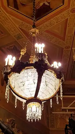 The flat ceiling is hexagonal in shape, split into sections by molded bands.[45] There is a square panel at the center of the ceiling, surrounded by hexagonal panels that contain murals. The central panel is itself divided into sections, with smaller panels that surround a square section; the mural in the central square has been removed.[53] Six chandeliers hang from the ceiling: two above the orchestra and four above the second balcony.[32][52] The ceiling contains air-conditioning vents, as well as a suspended truss.[52]