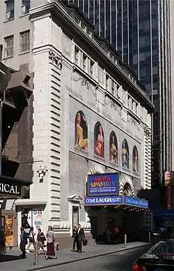 A revival of the musical Chicago relocated to the Shubert in February 1997[309][310] and remained until January 2003, when the show moved to the Ambassador Theatre.[309][311] A tribute to lyricist Adolph Green was hosted at the theater in late 2002, near the end of Chicago's run there.[312] The Jule Styne and Stephen Sondheim musical Gypsy then opened in May 2003,[313][314] running at the Shubert for a year.[315] As part of a settlement with the United States Department of Justice in 2003, the Shuberts agreed to improve disabled access at their 16 landmarked Broadway theaters, including the Shubert.[316][317] This was followed by a dance special, Forever Tango, in the latter half of 2004.[318][319] The theater's next hit was the musical comedy Spamalot, which opened in 2005[320][321] and ran for nearly four years.[322][323] It was succeeded by a three-month revival of Noel Coward's Blithe Spirit in 2009.[324][325] Yet another long-running show opened at the Shubert in October 2009: David Bryan and Joe DiPietro's musical Memphis,[326][327] which lasted for 1,166 performances through 2012.[328][329] During Memphis's run, three shows ran for one night each: Brigadoon in 2010, Camelot in 2011, and Oliver! in 2012.[31]