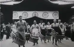 The Shunjuen strikers went to create two separate organizations: the "Great Japan Emerging Rikishi Group" (Dainippon Shinjin Rikishi-dan, 大日本新興力士団), by the Dewanoumi ichimon wrestlers, and the "Progressive Rikishi’ Group" (Kakushin rikishi-dan, 革新力士団), by non-Dewanoumi ichimon wrestlers. Both groups jointly organized tournaments and toured the country, performing in various locations such as Hibiya Park. On February 13, 1932, the organizations merged to form the "Greater Japan Sumo Federation" (Dai Nihon Sumo Renmei, 大日本相撲連盟), which held seven days shows in Osaka in March and Nagoya in April of the same year, followed by a 10-day show at the Yasukuni Shrine, in Tokyo, on May 3.[4] The Sumo Renmei worked on a different system than the Greater Japan Sumo Association of the time. The tournaments was a six-day individual competition in which the 31 wrestlers were divided into three ABC classes, with the winners and ranks determined by round-robin competition.[8]