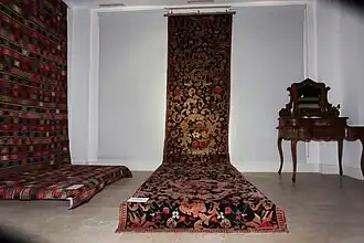 Until the end of October 2020, the museum consisted of about three hundred (300) carpets and flat weaves. This original collection had dated from the 17th century to the beginning of the 20th century. The majority of the collection presented traditional Karabakh carpet-weaving and Armenian carpet-weaving styles.[6] In addition to the locally woven carpets, there were few rugs, carpets, and flat weaves from Turkman, Afghan and Persian in the museum's collection. There were also Russian cultural artifacts in the museum. During his visit to the museum in August 2013, the President of the Republic of Artsakh Bako Sahakyan stated that the carpet museum plays an important role in preserving our national traditions and values and also for the development of tourism.[7]