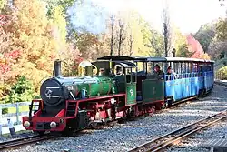 The Shuzenji Romney Railway (ロムニー鉄道, Romney Railway) is a 1.2 km, 15 in (381 mm) gauge ridable miniature railway located in Niji-no-Sato (Rainbow Park) in Izu, Shizuoka, on the Izu Peninsula in Japan. It is Japan's first 15-inch gauge railway. It is based on the English Romney, Hythe & Dymchurch Railway on the English Channel coast in Kent, which opened in 1927. The railway operates using a mixture of steam and diesel locomotives and enclosed saloon carriages. Its primary two steam engines were built by the Ravenglass and Eskdale Railway in Cumbria, England, and are based on that line's 1976 Northern Rock 2-6-2 steam locomotive. Its No. 2 locomotive Ernest W. Twining was acquired from the Fairbourne Railway in Wales when that line converted to 12+1⁄4 in (311 mm) gauge. There is also a small 15-inch gauge railway museum.