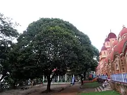 Srijit Thakur, from the Rajbari at Pathuriaghata Street near Natunbazar in Kolkata, is one of the few surviving member of the Thakur family whose ancestors set up the temple. According to the biographer of Rabindranath Tagore, Prabhat Kumar Mukhopadhyaya, the original surname of the Tagores was Kushari. They were Rarhi Brahmins and originally belonged to a village named Kush in the district named Burdwan in West Bengal. Rabindranath Tagore's ancestor Dinanath Kushari, the son of Bhatta Narayana was a native of this village.[13][14][15][16] Generations later different branches of the Kusharis migrated to different parts of Bengal; one of the branches migrated to Jessore District and settled there. One of the descendants Panchanan Kushari later came back from Jessore District in East Bengal to West Bengal and settled in Gobindopur.[17] "Panchanan got the title thakur, and since then his family member used to write the title Thakur instead of Kusari" --- as one of the priests said. Jairam Thakur (Kusari) from latter generation had four sons --- Anandiram, Nilmoni, Darpanarayan, and Gobindaram. Prince Dwarkanath Tagore was the next generation of Anandiram. Dwarakanath's son was Debendranath, and Rabindranath was Debendranath's eighth son. Debendranath, as a matter of fact, became Brahmo and did not believe in idol worshipping. It had not been known whether he or his sons ever visited the Kali temple in Shyamnagar --- founded by Gopimohan Thakur, son of Darpanarayan. Gopimohan had two sons, Prsanna Kumar and Harakumar, and a daughter --- Brahmamoyee.