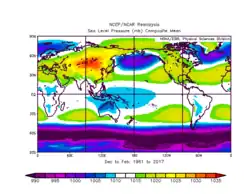 In spite of its immense influence on the weather experienced by a large proportion of the world's population, scientific studies of the Siberian High have been late in coming, though variability of its behavior was observed as early as the 1960s.[1] However, recent studies of observed global warming over Asia have shown that weakening of the Siberian High is a prime driver of warmer winters in almost all of inland extra-tropical Asia and even over most parts of Europe,[1] with the strongest relationship over the West Siberian Plain and significant relationships as far west as Hungary and as far southeast as Guangdong. Precipitation has also been found to be similarly inversely related to the mean central pressure of the Siberian High over almost all of Eastern Europe during the boreal winter, and similar relationships are found in southern China, whilst the opposite correlation exists over the Coromandel Coast and Sri Lanka. Other studies have suggested that the strength of the Siberian High shows an inverse correlation with the high-pressure systems over North Africa. Another correlation has been noted, a connection of a weaker Siberian High and Arctic oscillation when the Antarctic oscillation (AAO) is stronger.[8]