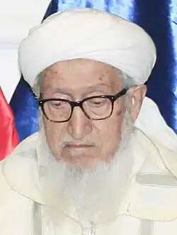 Sibghatullah Mojaddedi (Dari: صبغتالله مجددی; 27 September 1926[1] – 11 February 2019)[2] was an Afghan politician, who served as Acting President after the fall of Mohammad Najibullah's government in April 1992. He was the first leader to call for armed resistance against the Soviet-backed regime in 1979 and founded the Afghan National Liberation Front at the time; later becoming a respected figure among the various Afghan mujahideen. He served as the chairman of the 2003 loya jirga that approved Afghanistan's new constitution. In 2005, he was appointed chairman of the Meshrano Jirga, upper house of the National Assembly of Afghanistan, and was reappointed as a member in 2011. He also served on the Afghan High Peace Council. Mojaddedi is considered to have been a moderate leader.[3]