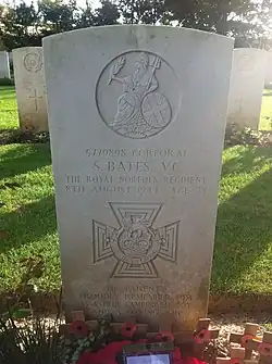 Corporal Sidney Bates VC (14 June 1921 – 8 August 1944) was a British recipient of the Victoria Cross, the highest and most prestigious award for gallantry in the face of the enemy that can be awarded to British and Commonwealth forces. Upon his unit being attacked Bates charged the enemy forcing the enemy to retreat, during which he was hit several times and died later of his wounds.