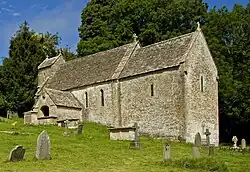 Gambier-Parry designed the coped tomb of his father, which is positioned in the churchyard east of the chancel of the Church of the Holy Innocents. The monument to Thomas Gambier-Parry is Grade II listed.[23][24][25] The architect also worked on the sanctuary and chancel arch of All Saints' Church on Oakleigh Road North in Friern Barnet, London.[26][27] In 1889 he restored the Church of St Margaret in Bagendon, Gloucestershire, now Grade 1 listed.[28] Improvements made to the Grade II* listed Church of St Mary in Bayford, Hertfordshire in 1890 were to his design.[29] Gambier-Parry made design changes to the Grade II* listed Church of St James in Quedgeley, Gloucestershire about 1890,[30] and later designed the Quedgeley War Memorial in the churchyard.[31] The glass in the chancel east window of Elmore Church in Elmore, Gloucestershire, was dedicated to Sir William Vernon Guise and designed by Gambier-Parry in 1890.[32] He also made improvements to Elmore Court in Elmore, Gloucestershire in the late 19th century.[33] In 1894 to 1895, he restored and enlarged the Grade II* listed St James' Church in Cranham, Gloucestershire.[34][35] In 1895 he made design changes to St Michael Church in Boulge, Suffolk, on behalf of the Holmes White family.[36] Gambier-Parry was also responsible for the late 19th century alabaster-work in the sanctuary of the Lady Chapel of St Mary the Virgin, Bathwick.[37] He was the architect of Whitemoor, opposite Amberley Church, in the western part of the parish of Minchinhampton, Gloucestershire.[38] In 1908, Gambier-Parry designed the Grade II listed Iveson Manor in Ampney St Peter, Gloucestershire.[39] About 1908, the first vicar of the Grade II* listed St Mary the Virgin, Bourne Street in London selected him to replace the reredos of the high altar. The architect installed an arch fabricated of dark wood and, above the arch, ornamentation in a sunburst design.[40][41] He also built the organ case and loft for St Mary's Bourne Street, using an English baroque style, with pediments, scrollwork, and finials.[40][42] The Grade II listed Pytte House of Clyst St George, Devon, was renovated and enlarged by Gambier-Parry in 1911.[43] In the 1930s, he restored St Michael's Church (pictured) at Duntisbourne Rouse in Gloucestershire, at the same time living in the nearby old rectory.[44][45] The church was Grade I listed in 1958.[46]