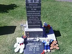 The Unknown Child (9 September 1910 – 15 April 1912) was the initially unidentified body of Sidney Leslie Goodwin, a 19-month-old British toddler who was recovered by the Mackay-Bennett after the sinking of the RMS Titanic. For almost a century, Goodwin's gravestone in the Fairview Cemetery read "Erected to the memory of an unknown child whose remains were recovered after the disaster to the Titanic April 15th 1912".