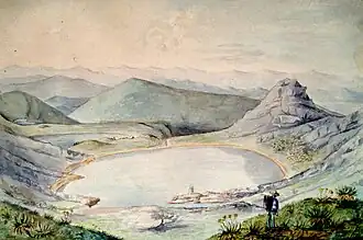 In the colonial period, the lakes were partly drained to extract the golden artefacts of the Muisca from the water. In 1855 a golden raft was found in one of the lakes, similar to the famous Muisca raft. It was named Balsa de Siecha or "Siecha raft" and pictured in the book El Dorado by Muisca scholar Liborio Zerda in 1883. The discovery of the raft made Zerda believe that the site of the initiation ritual of the new zipa was not in Lake Guatavita, yet in the Siecha Lakes.[5] Later, the raft was more-or-less legally taken from Colombia to Europe. The transporting ship burnt in the harbour of Bremen and the raft was lost.[4]