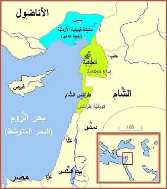 ![]() Map of Little Armenia (blue), Principality of Antioch (green-upper) and Tripoli (green-lower) in Masry | |||||||