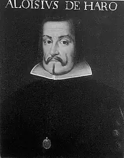 The Duke of Medina de las Torres had suggested that Philip IV himself should lead the relief of Badajoz in the company of all the Grandees of Spain.[32] Luis de Haro, Philip IV's favourite, however, feared that Queen Mariana of Austria would be given the government of the country during the absence of the king, and, although having no military experience, offered himself to lead the relief army.[32] His force consisted of up to 12,000 infantry and 4,500 cavalry, or perhaps as little as 8,000 infantry and 1,000 cavalry.[32] Haro did not reach Badajoz until mid-October, but his appearance compelled Mendes de Vasconcelos to abandon the siege.[31] The buildings in Cerro del Viento were set on fire and the bridge over the Gévora river was destroyed,[31] The Portuguese army retreated unmolested to Elvas having lost 6,200 men in all,[3] either killed in battle or dead from disease.[32]