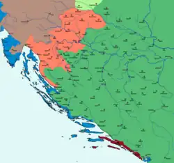 In 1578, Archduke Charles II decided to respond to Ottoman attacks with an offensive to push the frontier back to the Una River.[9] The offensive began in August and the joint Austrian-Croatian troops took back Cazin, Zrin, and Ostrovica, but they were stopped at Bužim and pushed back to the north, losing all gains. Bihać remained basically isolated on the Una River.[10] To strengthen the southern defences, the construction of Karlovac as a city-fortress began in 1579.[11] The string of garrisoned forts at the border became known as the Croatian Military Frontier.[4]