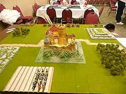 The game is played on a tabletop using 40mm medieval Elastolin miniatures manufactured by O&M Hausser. Bodenstedt owned the Continental Hobby Supplies store in Adelphia, New Jersey, and he used the rules to promote the sale of Elastolin miniatures, including the large central castle (Elastolin #9732).[1][2]