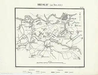 The Austrians and the French lost 17,000 troops, the entire garrison, plus the entirety of the stores in Breslau, over 1000 horses, 81 guns, and almost 700 officers, including 13 generals.[7] About 1200 of the defending force was killed.[8] The officers and men were permitted to keep their personal effects but all other provisions and materials were surrendered to the Prussians.[9]