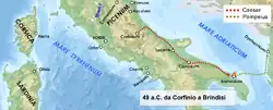 Escalating tensions over the previous decade between Gaius Julius Caesar and the Roman Senate, rallying around Gnaeus Pompeius Magnus ("Pompey the Great"), culminated in Caesar crossing the Rubicon river in January 49 BC and thus being labelled as an enemy of the people.[1] Caesar rapidly advanced down the Italian Peninsula capturing numerous cities, towns and settlements such as Arretium, Auximum and Asculum. Most significant was the siege of Corfinium where Caesar's bitter enemy Lucius Domitius Ahenobarbus was handed over to him in a bloodless victory which was achieved in only one week. Ahenobarbus had disobeyed Pompey's orders to rendezvous with him in Apulia where he was amassing his own forces, and as a result 33 of Pompey's cohorts surrendered to Caesar at Corfinium.[2]