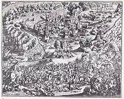 Free to concentrate on the siege, the Venetians and their allies dug two parallel tunnels under the western bastion, and filled mines with 250 gunpowder barrels recovered from the Ottoman relief army. The mine was exploded at dawn on 11 August, followed by an attack into the resulting breach. After a hard three-hour fight, the Venetians were pushed back, but returned to the attack by noon, while a small detachment was landed over water in the eastern rear of the fortress. Shortly after the signal for the general assault was given, the Ottoman garrison raised the white flag in token of surrender, and the attack stopped.[21] While negotiations were taking place for the surrender of the garrison, a cannon accidentally exploded; taking this as a sign of treachery, the Venetians and their allies stormed the citadel and massacred the garrison and its inhabitants, some 1,500 people in all.[22][18]