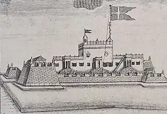 Danish India was established in 1620 at Tranquebar. A fort to secure the land and commerce in the area was constructed, given the name of Fort Dansborg.[2] Tranquebar would go on to be the center of commerce and trade conducted by Danish merchants in the Bay of Bengal.[3] Tranquebar was surrounded by the Thanjavur Nayak kingdom on land, and was to give an annual tribute to the Nayak,[4] though this right to tax Tranquebar was quickly surrendered to the Danes.[1]