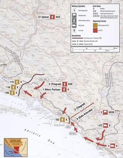 On 16 September 1991, the JNA mobilized in Montenegro citing the deteriorating situation in Croatia. Despite a radio broadcast appeal by the JNA 2nd Titograd Corps on 17 September, considerable numbers of reservists refused to respond to the call-up.[21] On 18 September, Đukanović threatened harsh punishment of deserters and those refusing to respond to the mobilization,[19] while calling to "draw the demarcation lines vis-à-vis the Croats once and for all".[22] The army mobilization and the propaganda of the Montenegrin government were in contrast with assurances from the Yugoslav federal authorities in Belgrade that there would be no attack against Dubrovnik.[23] The JNA's strategic plan to defeat Croatia included an offensive to cut off the southernmost parts of Croatia, including Dubrovnik, from the rest of the country.[24]