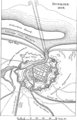 The siege of Dunkirk in 1658 was a military operation by France and the Commonwealth of England intended to capture the fortified port city of Dunkirk, Spain's greatest privateering base, from a Spanish garrison strengthened with English Royalists and French Fronduers. Dunkirk (Dutch for 'Church in the dunes') was a strategic port on the southern coast of the English Channel in the Spanish Netherlands that had often been a point of contention previously and had changed hands a number of times. Privateers operating out of Dunkirk and other ports had cost England some 1,500 to 2,000 merchant ships in the past year.[2] The French and their English Commonwealth allies were commanded by Marshal of France Turenne. The siege would last a month and featured numerous sorties by the garrison and a determined relief attempt by the Spanish army under the command of Don Juan of Austria and allied English Royalists led by Duke of York and rebels of the French Fronde under the Great Condé that resulted in the battle of the Dunes.