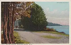Having learned from Dousman that the Americans at Mackinac were unaware of the outbreak of war, Roberts's force landed at a settlement later named British Landing on the north end of the island, 2 miles (3.2 km) away from the fort, early on the morning of 17 July. They quietly removed the village's inhabitants from their homes, dragged a 6-pounder cannon through the woods to a ridge above the fort and fired a single round before sending a message under a flag of truce, demanding the surrender of the fort.[9]