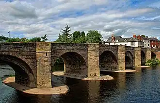Leven's advance into Herefordshire brought him into conflict with the fortified manor house at Canon Frome near Ledbury, commanded by Colonel Sir John Barnard. After the Scottish forces stormed the place they massacred many of the defenders and executed Barnard.[5] On reaching Hereford, Leven had around 14,000 troops under his command while Scudamore had 1,500 defenders. After an initial fight around the bridge over the River Wye, Leven offered terms to Scudamore but he rejected them as he could not surrender without the king's permission. Scudamore still hoped to receive relief from Charles in Wales. Leven kept very strict discipline amongst his men regarding looting.[6]