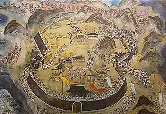 The siege of Jeonju Fortress was a conflict in May 1894 that concluded the first revolt of the Donghak Peasant Revolution. The Donghak Peasant Army that won the Battle of Hwangryong River immediately aimed its sword at Jeonju. In the early morning of April 27, the peasant army formed a line at Yongduchi overlooking Jeonju Fortress and prepared to advance. Already the day before, the peasant army that had beheaded Lee Hyo-eung, a messenger carrying a letter of appeasement from King Gojong, and Bae Eun-hwan were filled with solemn determination. After throwing the messenger and messenger sent by the king onto the corpse. They occupied Jeonju Fortress with little resistance, which was what is known as a bloodless occupation as Jeonju Castle was in a defenseless state. Around Jeonju Castle, from April 28th to May 3rd in 1894, there were various battles between the Garrison Army led by Hong Gye-hun and the peasant army. After losing the Battle of Wansan, the Joseon government concluded the first revolt of the Donghak Peasant Revolution with the Jeonju Treaty (전주 화약).[1][2]
