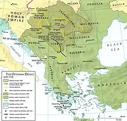 During the Austro-Turkish war of 1663–1664, Austrian troops tried unsuccessfully to retake the fortress, but through poor supplies and lack of help from the Emperor, the Christian forces under Miklos Zrinyi had to retreat. The Viennese Military Council began to discuss the retaking of Kanizsa after 1689. They did not want to lose many soldiers so they decided to starve the castle out. The Emperor sent General Donat John and Ádám Batthyány, Chief Captain of the Trans Danubian Region, along with Colonel István Zichy and Colonel János Inkey against Kanizsa in January 1690.[1] They had about 60,000 men under their command. They took the smaller fortifications around Kanizsa, then the blockade began.[2]
