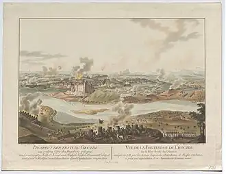 In the siege of Khotyn (Khotin, Hotin; 2 July – 19 September 1788) a Habsburg Austrian army led by Prince Josias of Saxe-Coburg-Saalfeld and an Imperial Russian army commanded by Ivan Saltykov besieged an Ottoman Turkish garrison in the fortress of Khotyn. The Allies eventually forced the surrender of the fortress. The siege was part of the Austro-Turkish War and the Russo-Turkish War.
