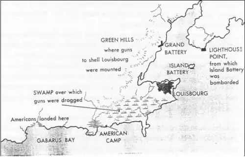 Upon landing, the provincial forces immediately launched an attack on the North East Harbour (present-day Louisbourg, Nova Scotia). The act terrorized the French and they abandoned the Royal Battery with much of its armaments still operational.[19] The provincials immediately occupied the battery and began firing at the fortress. They repulsed a French and Indian attempt to re-take the battery the following day.
