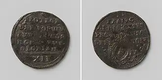 The situation inside the city was becoming increasingly gloomy. Without news from outside since 18 April 1579, Schwarzenberg ordered emergency coins valued at half, one and two stuivers to be minted in red copper on 28 April. This became the only money of legal course in Maastricht during the siege, and the prices of food, drinks and clothes were regulated by the military command.[120] Food restrictions were imposed on 4 May 1579 when Schwarzenberg ordered the two deans of the butchers' guild to inspect every house and stable in the city to prepare a list of the extant cattle. The burghers complained, as they had fed the garrison for longer than a year. Each soldier was paid four stuivers daily, the stonemason masters ten, and the poor people was fed at the expense of the town council, but the burghers were unable to exert their offices and received no compensation. Moreover, on 22 May, those who possessed wheat, rye or other grain in a quantity considered larger than sufficient to meet their basic needs, were ordered to sell it at the market at a fixed price.[121]