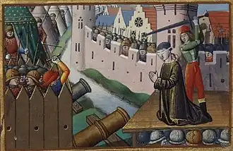 Meaux was sited on a loop of the Marne, "with the walled city and its suburbs on the north bank and a smaller, heavily fortified area known as the Marché inside the riverbend, joined to the rest of Meaux by a single bridge."[3] The place was "well vittled and also manned",[3] held by a garrison of "one thousand diehard dauphinist troops."[3] The town's defense was led by the so-called "bastard of Vaurus",[3] by all accounts a "singularly vicious lord",[3] but a brave commander all the same. He was rumoured to have tied "a heavily pregnant woman to an elm tree - his favourite execution spot - so that as she gave birth her screams attracted wolves, which ripped her to pieces and ate her newborn."[3] The siege commenced on 6 October 1421 with mining and bombardment.