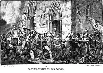 The fighting continued with hand-to-hand clashes that took place house by house, until the insurgents' last major point of defense, the Magdalen convent, was surrounded and destroyed. Members of the clergy also took part in the defense of the monastery assaulted by the Neapolitans.[44] The surviving "camiciotti"[45][46] who defended it preferred to commit suicide than to fall alive into the hands of the Neapolitans by throwing themselves into a well.[47] The names of seven of them are known: Antonino Bagnato, Carmelo Bombara, Giuseppe Piamonte, Giovanni Sollima, Diego Mauceli, Pasquale Danisi, and Nicola Ruggeri.[48] Even the fall of the Magdalene monastery did not mark the end of the fierce battle, as the insurgents still defended themselves in the neighborhood behind, where the Swiss mercenaries proceeded to systematically set fire to all the buildings. The Bourbon troops did not spare even the City Hospital, to which they set fire, burning inside it many sick and wounded who were hospitalized there: "They set fire to the great Hospice, and burned inside it many sick and wounded."[49] Having taken or rather destroyed the quarter that lay between Via Imperiale and Via Porta Imperiale, the Bourbon units advancing from the south, that is, from the naval bridgehead, joined those coming from the Citadel.