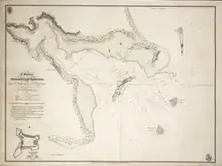 The Dutch attempted to capture two Portuguese vessels in the inner harbour, however they came under heavy fire from the fortress and upon bringing them in tow they ran aground and were later burned.[2] Verhoeff landed his soldiers on the island and after occupying the evacuated town, trenches were dug, artillery batteries set and the fort subjected to a bombardment, however the Portuguese resisted eagerly and repaired the walls at night. The height of the walls however made it difficult for the Portuguese to fire their cannon on the assailants. An incident occurred within the fortress in the first day of the siege, where a soldier let a lighted fuse fall on a quantity of gunpowder, igniting it, killing a few men and causing a fire which nearly consumed the storehouses.[6] On the second day a breach was opened on the walls, but the Dutch failed to exploit it.[3] A contemporary Portuguese writer commented that: