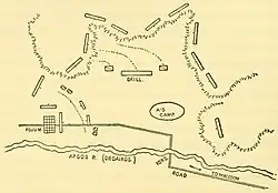 There were still some Illyrian light infantry on the heights that commanded the ford, and it was critical for Alexander to seize these heights in order to gain control of the entire plain. Before engaging in battle, Alexander decided to re-establish his camp on the far side of the river near the ford in order to ensure the security of both his operations and his camp. However, in the process of doing so he ran the danger of being engaged in the rear while his troops were crossing the river. The Illyrians indeed attacked him, perceiving his army to be retreating. So he ordered his troops to turn around to simulate an advance, while initiating a charge with his companion cavalry. Meanwhile, he also ordered his archers to turn around and fire their arrows from mid-stream.[8] Having gained a place of relative security on the far side of the river, Alexander was able to freely supply his army and await reinforcements.[7] After three days,[1] before reinforcements arrived, however, Macedonian scouts reported that they observed the Illyrians becoming careless in protecting the settlement, as they thought Alexander was in retreat.[7]
