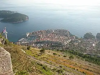 ![]() Present day Dubrovnik (Ragusa) and Lokrum island from atop Srđ hill near the Imperial fortress where Hoste hoisted his artillery to bombard the town. | |||||||