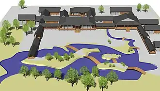 The siege of the Sanjō Palace was the inciting incident of the Heiji Rebellion (平治の乱, Heiji no ran, January 19 – February 5, 1160) during the late Heian period of Japan .[1] The conflict arose from feud between court advisors Fujiwara no Nobuyori and Fujiwara no Michinori, both of the powerful Fujiwara clan, with each respectively allied alongside the warrior clans of the Minamoto (Genji) and Taira (Heiki).[2] The Siege is the focal point of the Japanese war epic (軍記物語, Gunki monogatari) The Tale of Heiji (平治物語, Heiji monogatari) and the corresponding Illustrated Scrolls of the Tales of the Heiji (平治物語絵巻, Heiji monogatari emaki).[3] The Night Attack on Sanjō Palace (Sanjō-den yo-uchi no maki) handscroll is the most prominent of the three extant Illustrated Scrolls and belongs to The Museum of Fine Arts, Boston, in Boston, Massachusetts, where it currently resides on display.[4][2]